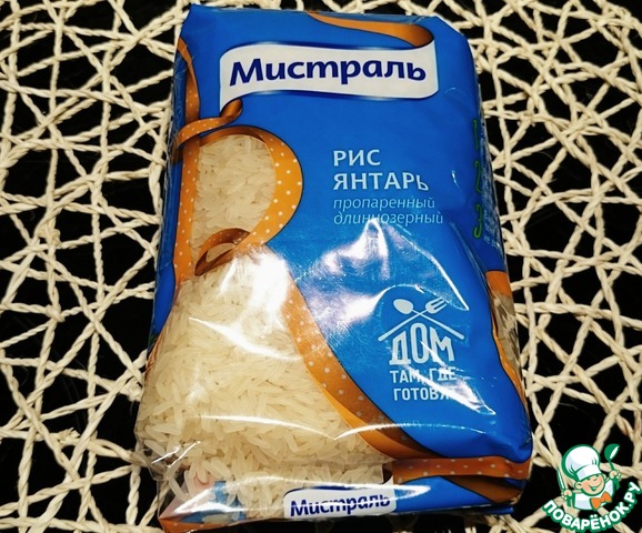 В данном рецепте используется рис пропаренный длиннозерный "Янтарь" ТМ Мистраль.
