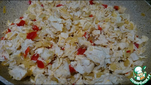 К ним добавляются нарезанные перец и куриная грудка (предварительно сваренная и разобранная).
