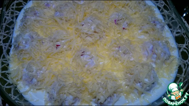 Приготовленным соусом заливаются шарики, посыпаются тертым сыром и отправляются в разогретую до 180 градусов духовку на 15-20 минут, пока сыр не подрумянится.