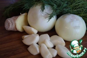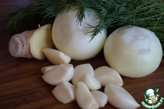 Лук, чеснок и имбирь очистить. Зелень промыть и обсушить.