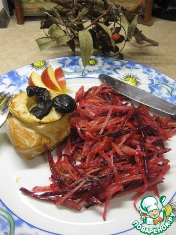 Вкусная курочка, люблю такое сочетание. А вот гарнир для любителей свеклы. Так как яблоки у меня маленькие – положила по 2 кружочка. Получились вот такие глазастики.