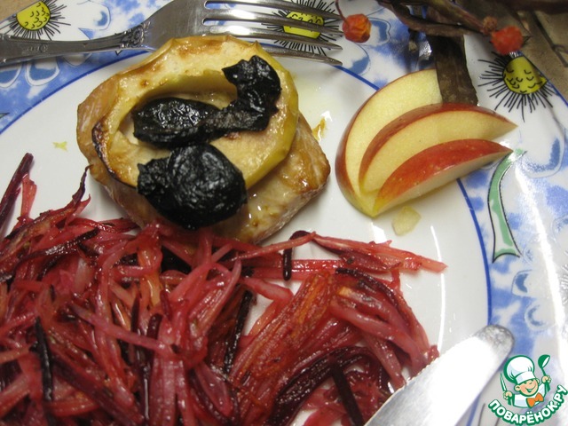 • Затем расправленный чернослив по желанию и вкусу, можете покрыть им всю яблочную поверхность. И отправляем в разогретую до 220С духовку на 15-20 минут (ориентируйтесь на свою духовку, главное не пересушить мясо!), почти до готовности.