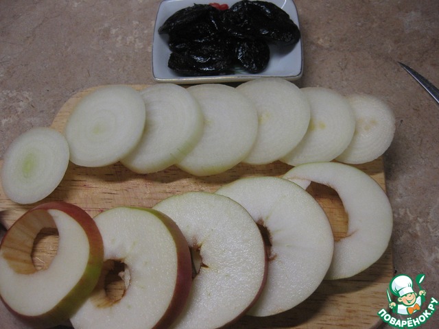 • Лук чистим, яблоко моем, удаляем сердцевину, чернослив моем и сушим.