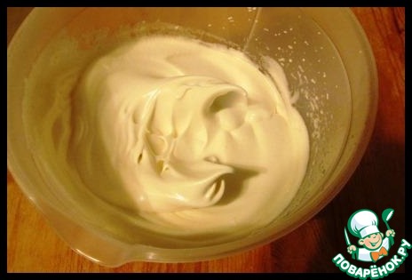 Взбиваем белки в пену, постепенно добавляем сахар и взбиваем до твердых пиков