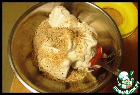 Осторожно перемешиваем методом складывания: опускаем лопатку вдоль стенки миски до дна, массу со дна перекладываем наверх, немного поворачиваем миску и снова повторяем процесс. Размешиваем до равномерного распределения миндальной крошки, минуты 2-3.