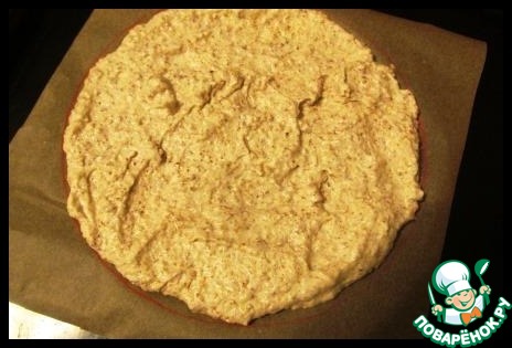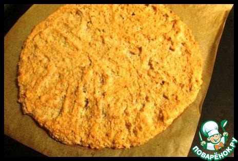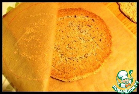 На доску кладем ещё один лист пергамента. Готовый корж переносим вместе с бумагой, на которой он выпекался, и быстро переворачиваем на лист пергамента тестом вниз. С горячего коржа осторожно снимаем бумагу.
