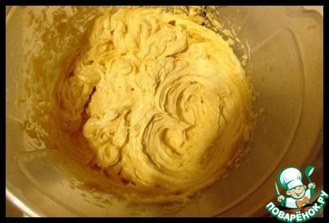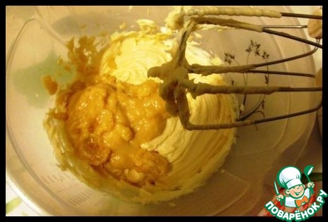 Совсем мягкое сливочное масло кладем в миску и миксером взбиваем до пышности, постепенно добавляем остывшую до комнатной температуры желтковую основу