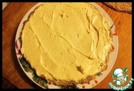 Аккуратно переносим один корж на блюдо и выкладываем половину крема.