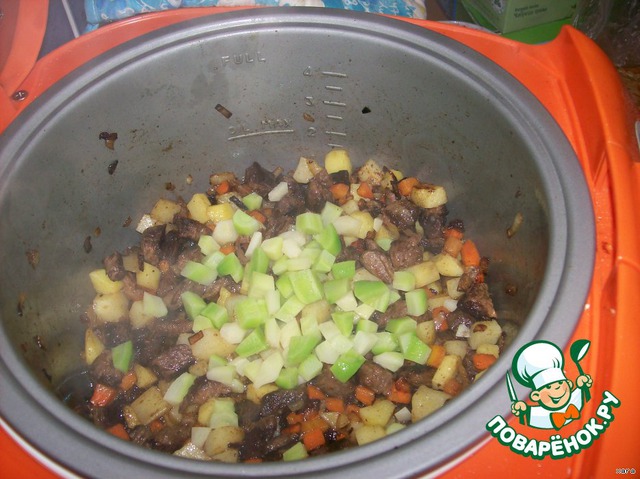 Далее добавляем подготовленные овощи. После добавления каждого овоща обжаривать на сильном огне при помешивании 2-3 мин. Овощи закладываются в следующем порядке: лук,