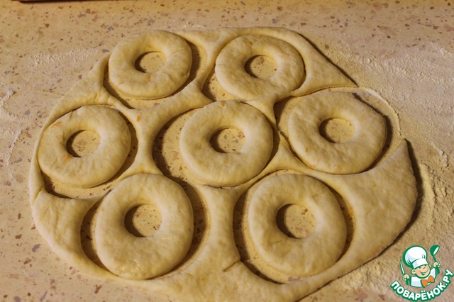 Тесто разделить на две части, для удобства раскатки. Раскатать одну часть в пласт примерно 3-4 мм, вырезать формочкой или стаканом фигурки, накрыть полотенцем и оставить на 20 минут для подхода. То же самое проделать с остальным тестом.