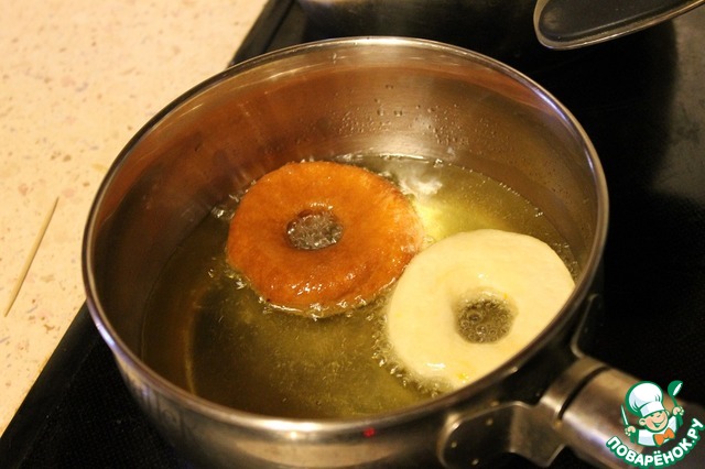 В ковш налить масло, высотой примерно 2-3 см, разогреть и обжарить пончики с двух сторон на медленном огне, до золотистого цвета.