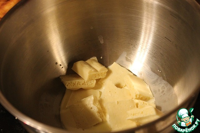 Глазурь будем готовить на водяной бане. Сначала налить сливки, довести их до горячего состояния, но не кипятить!!! Затем добавить поломанный шоколад.