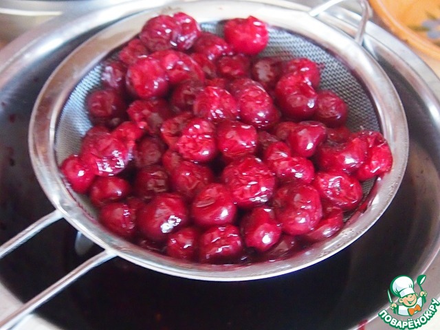 Я пекла кекс с мороженой вишней. Поэтому первый наш шаг - это разморозить вишню без косточек, лучше всего это делается на ситечке, чтобы стекла лишняя жидкость.