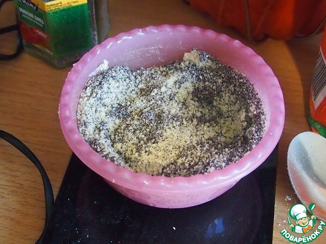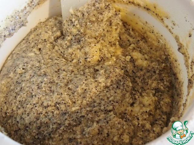 В масляно-яичную смесь высыпать муку с разрыхлителем, размешать. Добавить миндаль с маком, размешать.