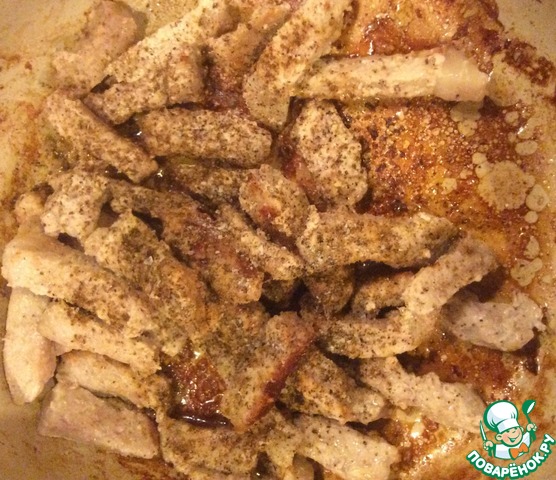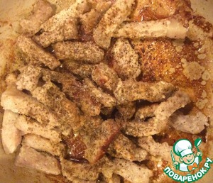 • В сковороду влить растительное масло и хорошо нагреть. Выложить мясо и обжарить до золотистой корочки. Добавить соевый соус, черный молотый перец и хмели-сунели. Немного посолить. Хорошо перемешать.