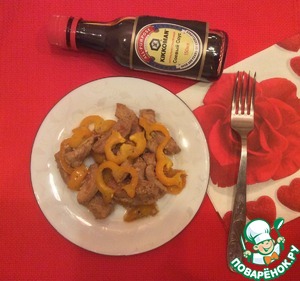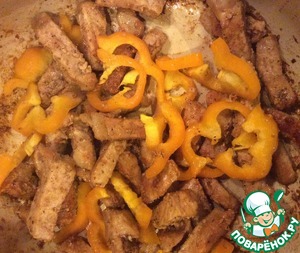 • Болгарский перец нарезать соломкой и добавить к мясу со специями. Перемешать.