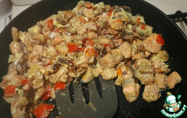 Перемешиваем яйца с остальными ингредиентами на сковороде. Солим по вкусу.