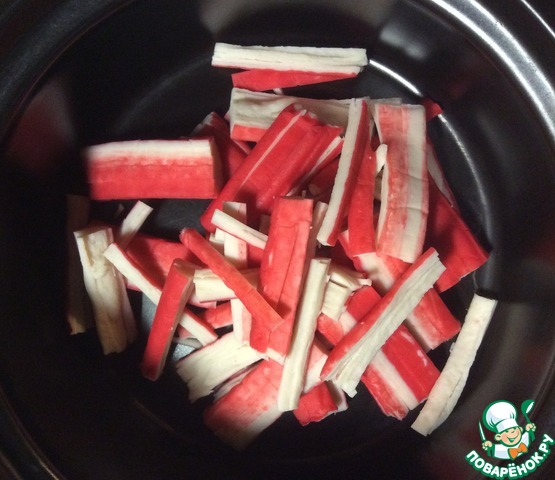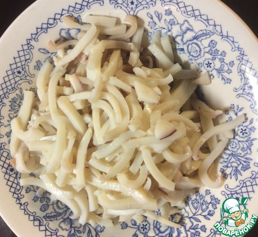 Поместить в кипящую воду и варить 2-3 минуты. Воду не солить (иначе салат будет пересолен)! Нарезать соломкой.