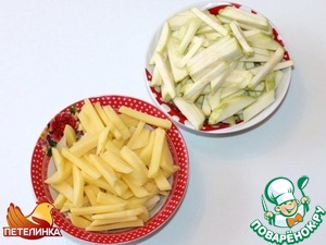 8. Овощи моем, сушим бумажным полотенцем. Картофель очищаем от шкурки и нарезаем тонкой соломкой (1 см). Кабачок можно порезать крупной соломкой или кружочками.