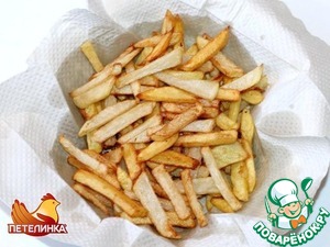 9. Приготовим картофель фри. Разогреваем растительное масло во фритюрнице и небольшими порциями кладем картофель, жарим до золотистого цвета. После картофеля обжариваем кусочки кабачка. Готовые овощи достаем шумовкой и перекладываем на бумажное полотенце.