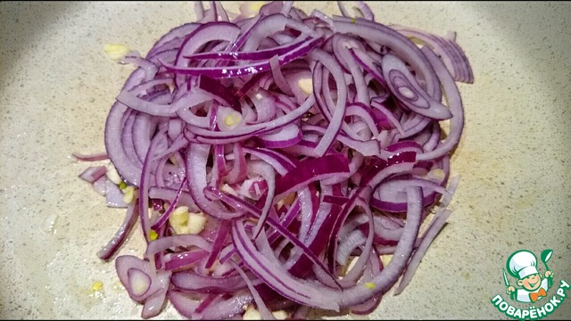 Лук и чеснок нарезаются тонкими полукольцами и кружочками соответственно, затем обжариваются до мягкости.