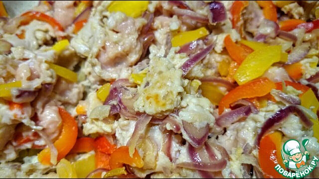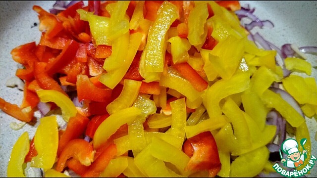 Нарезаются соломкой перцы, добавляются к луку и чесноку.