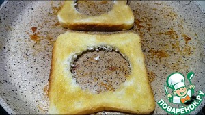 В каждую хлебную серединку разбивается яйцо, которое можно посолить/поперчить по вкусу. Обжаривается на большом огне минуту-две.