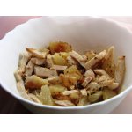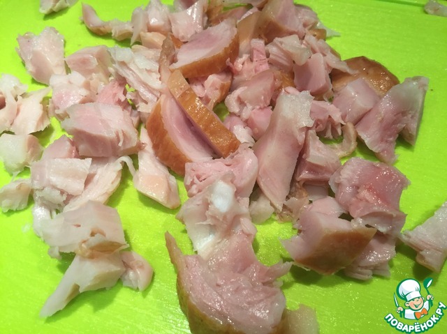 • У копчённого куриного окорочка удалите кожу, отделите мясо от костей и нарежьте небольшими кусочками.
