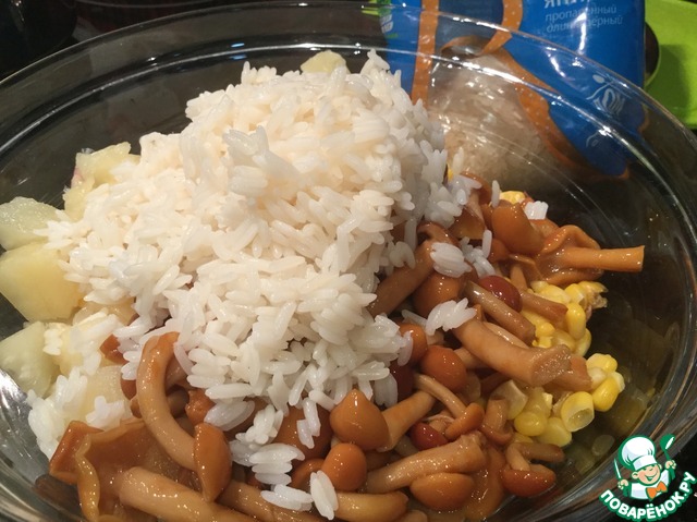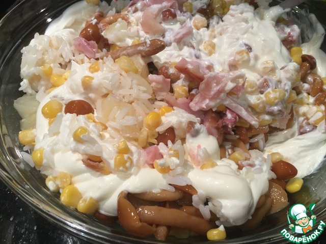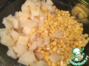 • В большой миске смешайте курицу, порезанные на кусочки ананасы, кукурузу...