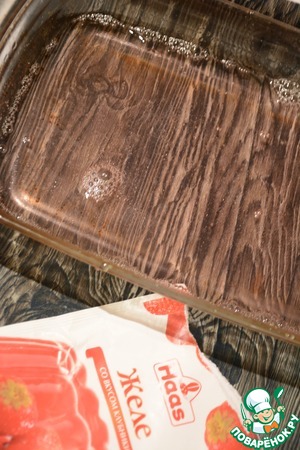 Приготовим Желе - у меня готовая пачка клубничного вкуса от Haas. На упаковке простая и понятная инструкция - 200мл. горячей воды добавить к смеси из пакета и перемешать до полного растворения и в холодильник.