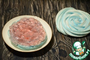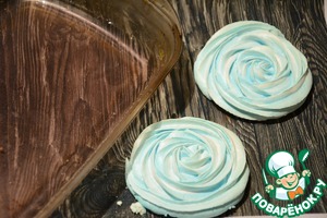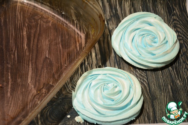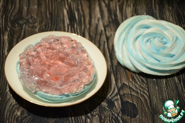 Безе готовить около часа в духовке при 100 градусах. Готовое безе достать, остудить. Желе достать из холодильника.