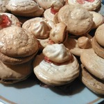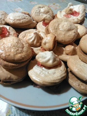 Желе ложкой положить на безе, накрыть второй половинкой. Можно подать сразу, а можно оставить на ночь в холодильнике, проверено - безе остается таким же хрустящим.