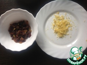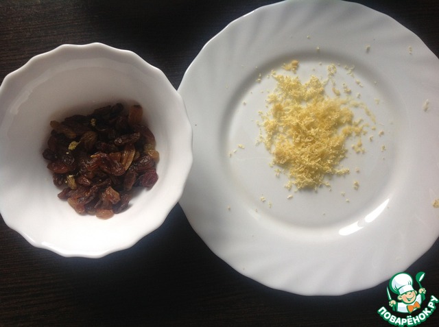 Тесто разделить на три части, в каждую из которых добавить наполнитель и перемешать. 1 наполнитель: изюм и натертая цедра лимона.