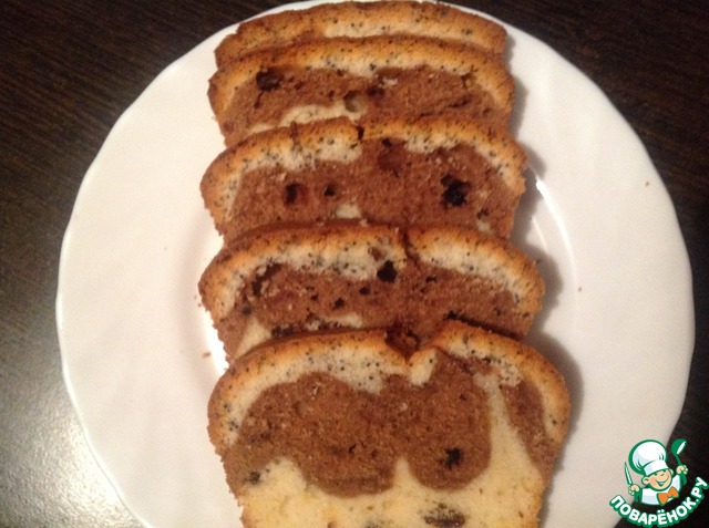 Выложить в подготовленную форму (смазать маслом или застелить пекарской бумагой) поочередно слои теста: 1 слой с изюмом и цедрой, затем шоколадный. Сверху - маковый. Выпекать при 170 градусов 60 минут до сухой лучины. Готовый кекс осторожно вынуть из формы и остудить. Кекс очень нежный.