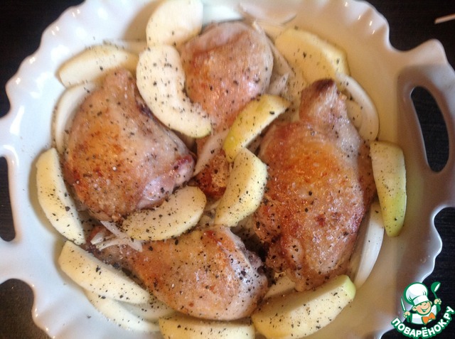 Очистить лук и яблоко, лук нарезать полукольцами или четвертинками - как вам больше нравится. Яблоко нарезать крупными дольками. Лук и яблоки положить в форму к курице. Посолить, поперчить.