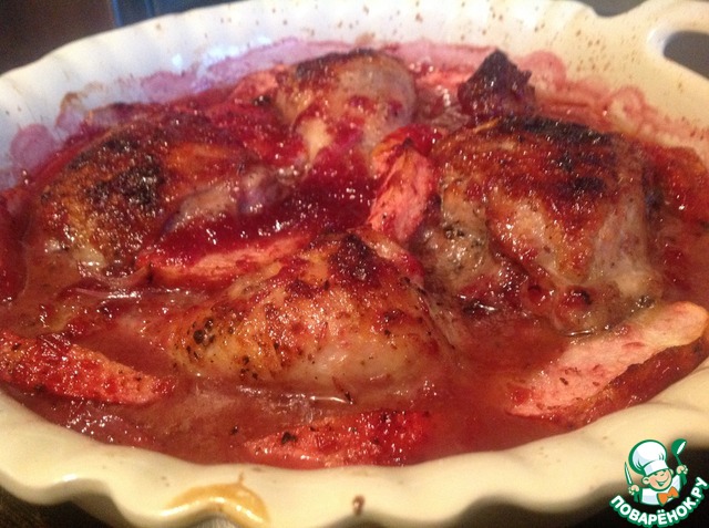 Залить курицу брусничной смесью. Запекать в духовке, нагретой до 200 С в течение 30 минут.