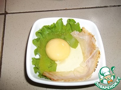 • Индивидуальную маленькую форму для запекания хорошо смазать маслом. По стенкам формы выложить тонкие ломтики ветчины (я добавила салатный листик - не обязательно). Осторожно разбить яйцо, не повредив желток.