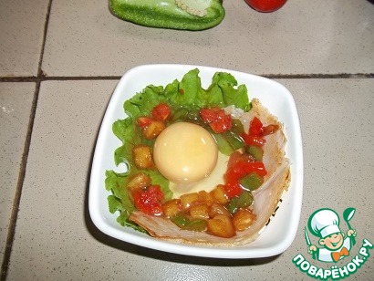 • Добавить подготовленные соевые овощи с ананасом. Самую чуточку подсолить желток. Поставить формочку в огнеупорную ёмкость с горячей водой и запекать в разогретой до 200 градусов духовке до готовности белка, желток должен быть "всмятку" (мне потребовалось 10 минут). Можно воспользоваться мокроволновкой, это займет меньше времени. При подаче припудрить глазунью сладкой паприкой или перцем, по желанию.