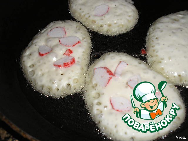Выкладываем тесто для оладушек на раскаленную сковороду, а сверху вталкиваем кусочки крабовых палочек.