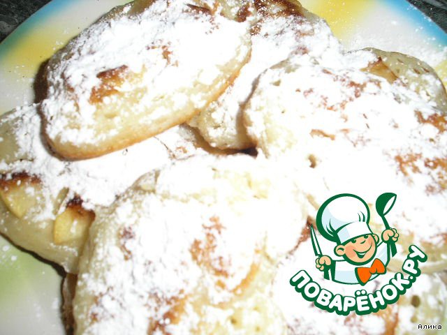 Я еще таким же образом сделала оладушки с кусочками яблока. Пришлось обильно засыпать их сахарной пудрой, так как тесто было соленоватым.