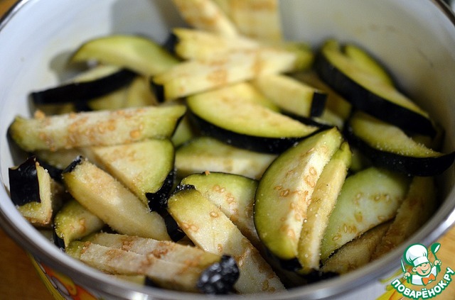 Баклажаны нарезаем, посыпаем солью и оставляем на 15-20 минут, чтобы вышла горечь. Затем промываем их и обсушиваем.