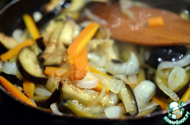 Лук шинкуем полукольцами, морковь нарезаем соломкой. Обжариваем их на масле минут 7-10. Затем добавляем баклажаны и жарим еще минут 5-7.
