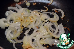 Лук нарежьте полукольцами и обжарьте на растительном масле до золотистого цвета.