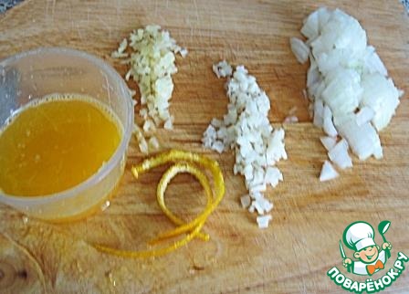Лук, чеснок и имбирь мелко нарезать, с апельсина снять две полоски крупной цедры, остальную цедру натереть, затем из апельсина выжать сок (50 мл).