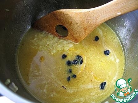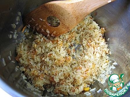 Добавить рис и быстро обжарить при постоянном помешивании, каждая рисинка должна быть покрыта маслом.