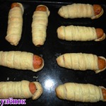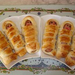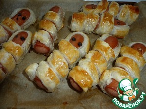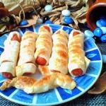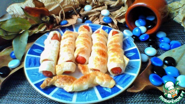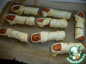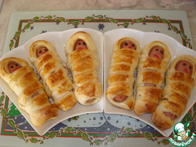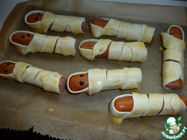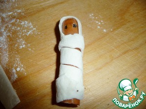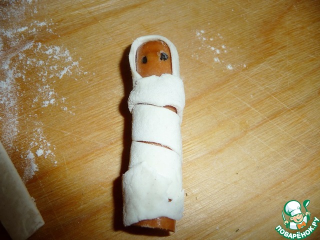 Для приготовления сосисок-мумий возьмите любые длинные сосиски, разрезать их пополам. В «прорези для глаз» вставить маленькие точечки из горчицы, семен кунжута или черного переца.