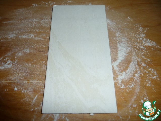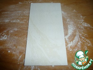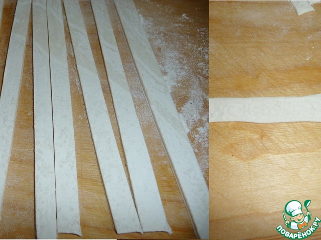 Нарезать на полоски шириной до 1 см., немного подкатать в длину.