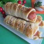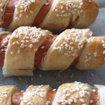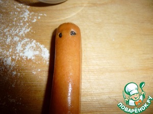 Сосиски обкрутить полоской теста, оставив свободное место для "головы", концы теста смочить водой, чтобы склеились.