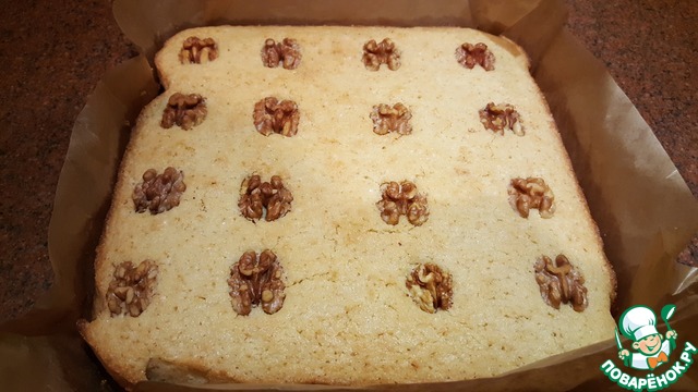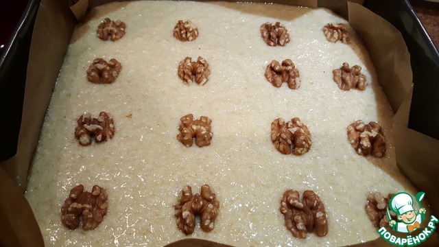 Самое удобное застелить форму бумагой для выпечки. Вылить тесто в форму. Потрясти немного, чтобы разровнять. Выложить орехи на некотором расстоянии друг от друга. И поставить форму в разогретую духовку на 35-40 минут. Ориентируйтесь по Вашей духовке!