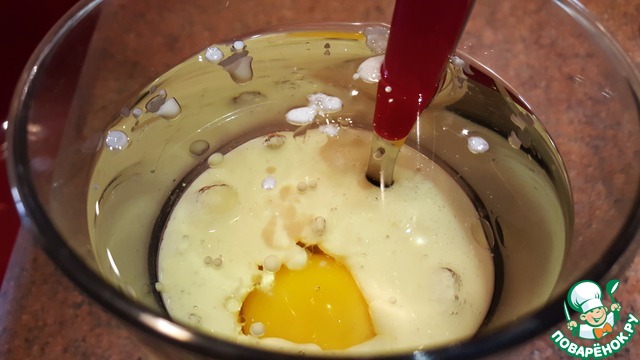 Вылить жидкую смесь в миску к сухой смеси и тщательно перемешать.